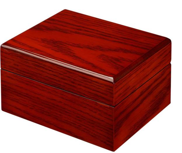 Single mahogany wood grain watch box with white leather interior.